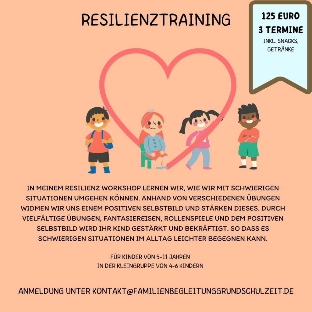 In meinem Resilienz Workshop lernen wir, wie wir mit schwierigen Situationen umgehen können. Anhand von verschiedenen Übungen widmen wir uns einem positiven Selbstbild und stärken dieses. Durch vielfältige Übungen, Fantasiereisen, Rollenspiele und dem positiven Selbstbild wird ihr Kind gestärkt und bekräftigt. So dass es schwierigen Situationen im Alltag leichter begegnen kann.