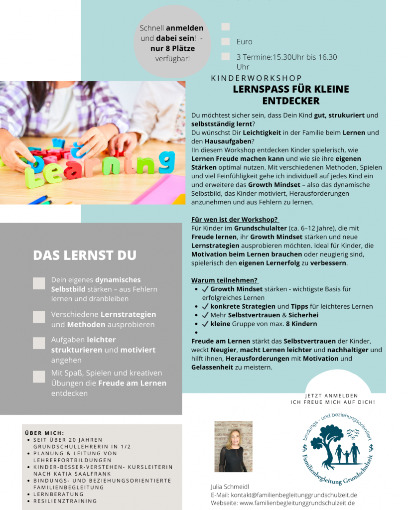 Bei unseren Workshops „Lernspaß für kleine Entdecker“ entdecken Kinder spielerisch ihre Stärken, lernen mit Freude und entwickeln ein dynamisches Selbstbild (Growth Mindset). Kinder mit Growth Mindset geben bei Schwierigkeiten nicht auf, sondern üben so lange, bis sie Aufgaben meistern. So entwickeln sie Motivation, Ausdauer und Freude am Lernen – Fähigkeiten, die sie ein Leben lang begleiten.