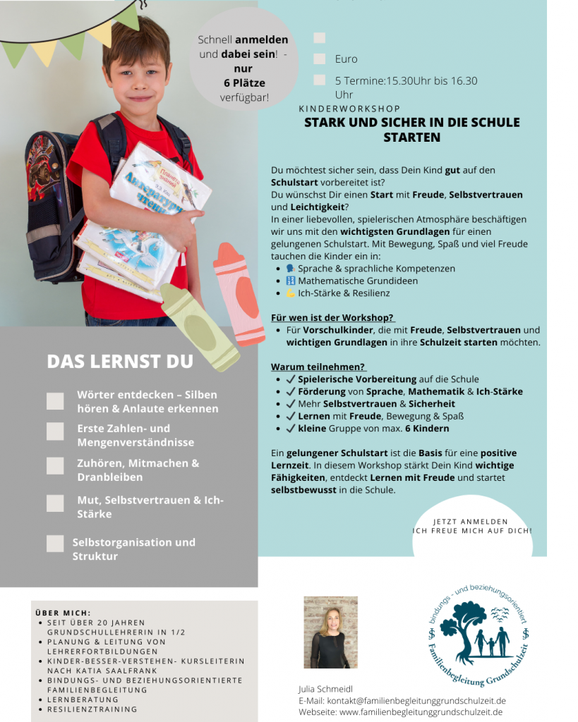 In meinem Workshop „Gut in die Schule starten“ bereiten wir Kinder spielerisch auf einen erfolgreichen Schulstart vor. In kleinen Gruppen von 6–8 Kindern im Alter von 5–7 Jahren stärken wir das Selbstbewusstsein, fördern die Freude am Lernen und üben wichtige Grundlagen für Sprache, Mathematik und soziale Kompetenzen.