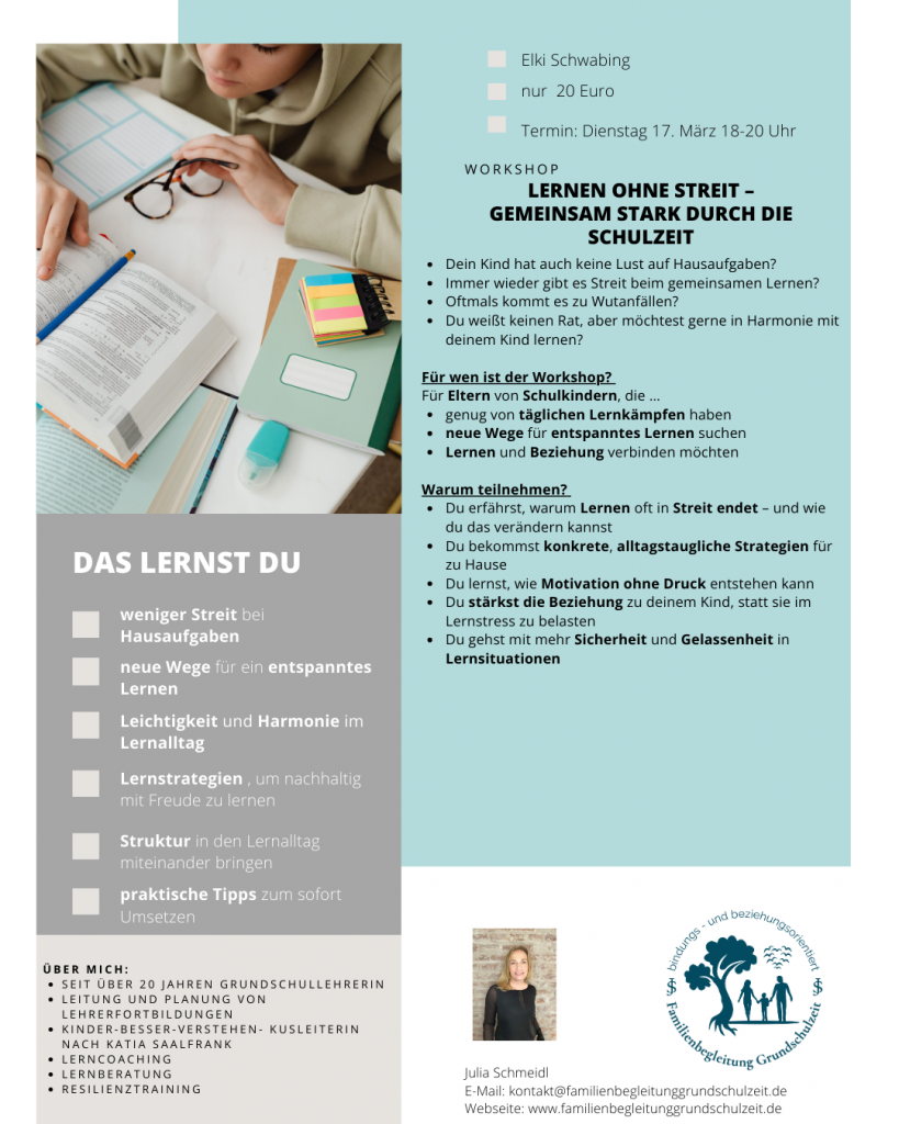 Dein Kind hat auch keine Lust auf Hausaufgaben? Immer wieder gibt es Streit beim gemeinsamen Lernen? Oftmals kommt es zu Wutanfällen? Du weißt keinen Rat, aber möchtest gerne in Harmonie mit Deinem Kind lernen? Der Workshop ist für Eltern von Schulkindern, die genug vom täglichen Lernkampf haben, neue Wege für ein entspanntes Lernen suchen, sowie Lernen und Beziehung verbinden möchten.